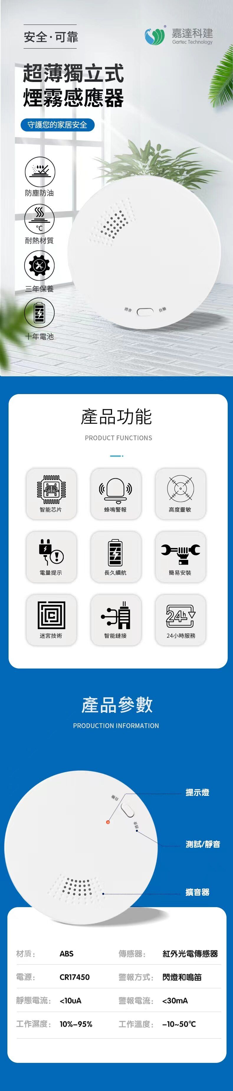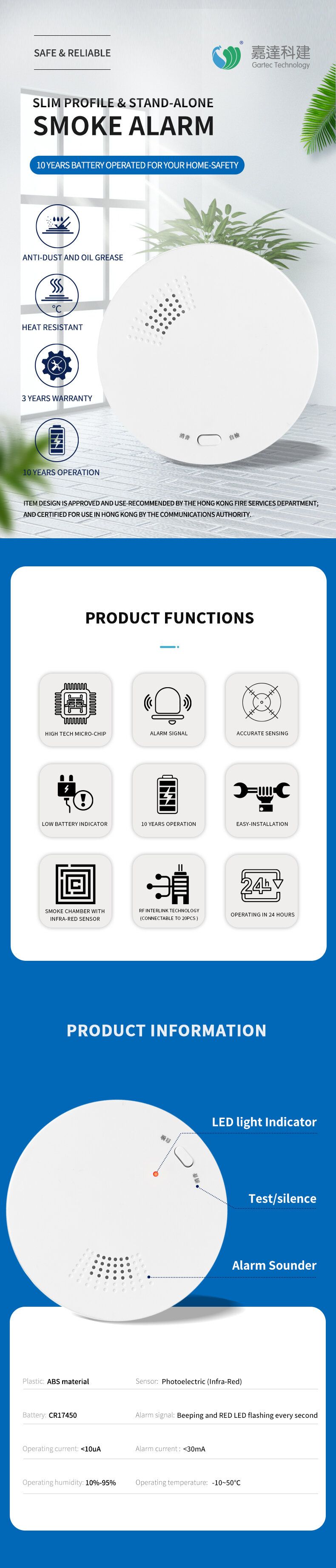 • Accurate detection: High-sensitivity smoke sensor, three-second rapid response