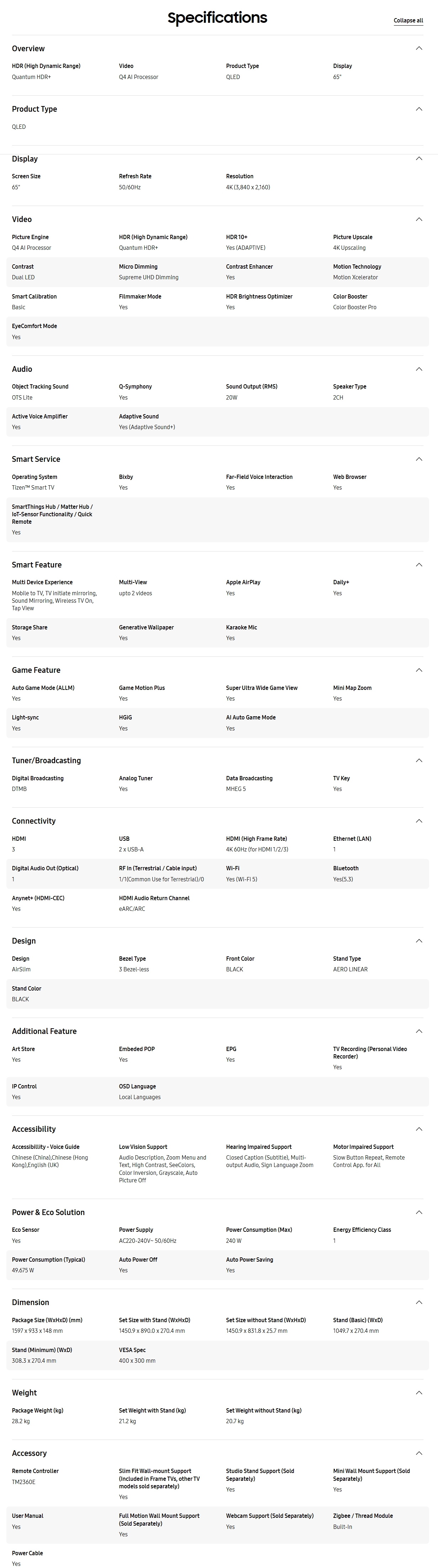 Q4 AI processor, 4K high-resolution enhancementTUV True Quantum Dot Display certification, Dual LED innovative backlight technologyQuantum HDR+ with more immersive color detailsExclusive Art Store feature, featuring over 4,000 renowned global artworks
