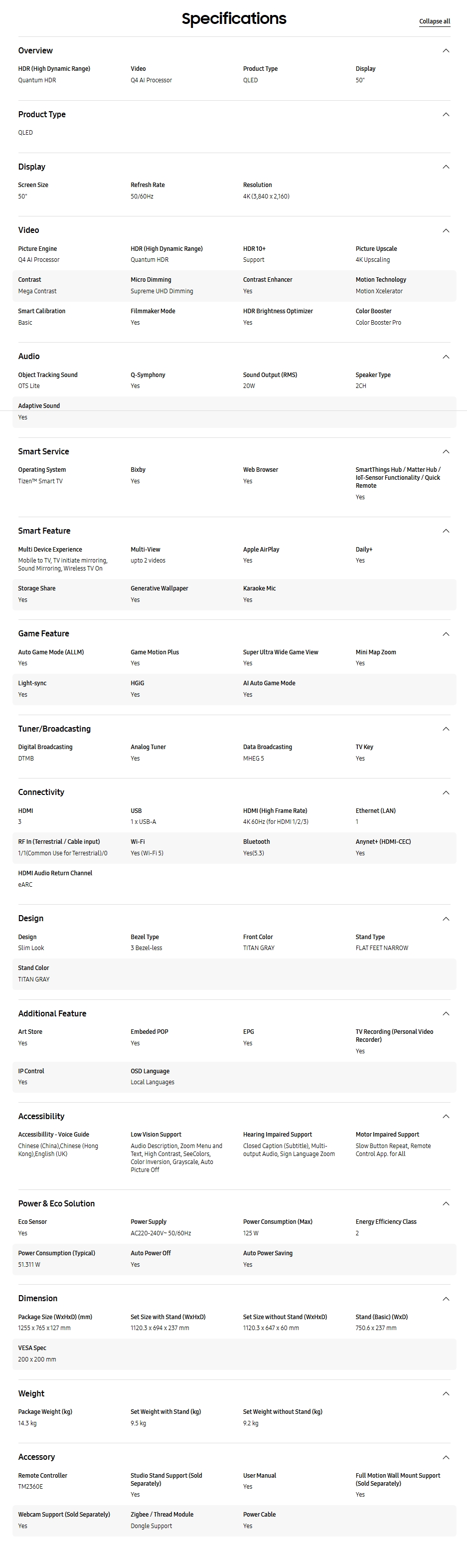 Q4 AI processor, 4K high-resolution enhancementTUV True Quantum Dot Display certification, Quantum HDRExclusive Art Store feature, featuring over 4,000 renowned global artworksQuantum Dot technology achieving 100% color gamut