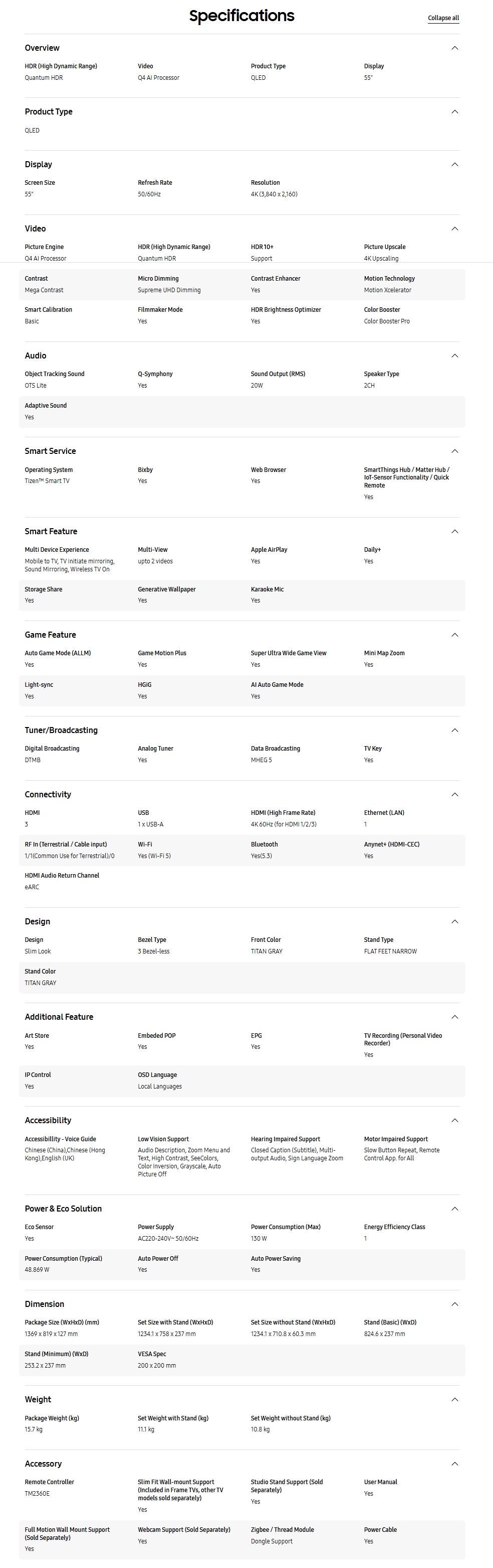Q4 AI processor, 4K high-resolution enhancementTUV True Quantum Dot Display certification, Quantum HDRExclusive Art Store feature, featuring over 4,000 renowned global artworksQuantum Dot technology achieving 100% color gamut
