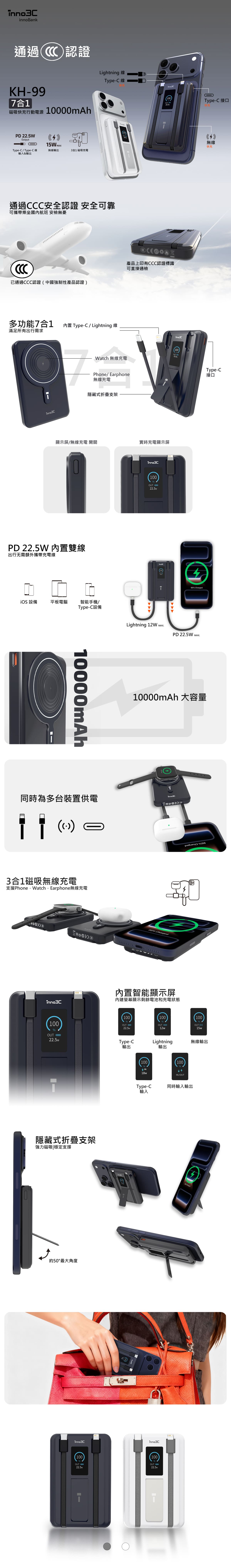 • 無線快充|支援高達15W的無線快充,充電不用久等。• Type-C 口 及 Type-C 線 PD3.0 雙向快充|最高22.5W輸出和18W快速輸入,配備PD3.0協議,兼容Apple , Android等設備快速充電。• 強力磁吸設計|磁吸充電穩固,充電時不易脫落。• 智能顯示螢幕|即時顯示電量與充電功率,狀態一目了然。• 內建雙充電線|內置Type-C與Lightning線,不怕忘記帶線無法充電。• 一物多用設計|可充手機、Apple Watch、耳機等,手機支架邊充邊看更方便。• 10000mAh大容量電池|輕鬆應對日常與旅途所需電力。• 多裝置同時充電|支援無線和有線同時輸出,效率加倍。• 金屬外殼|穩固耐用。• 多重安全防護|防短路、防過載、防過熱、防過流,安全有保障。• 通過CCC認證 及 CE認證|測試通過安全認證,放心使用。